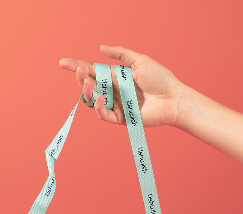 Tishwish grosgrain ribbons are made with GRS Certified Recycled polyester and printed with planet-friendly inks.